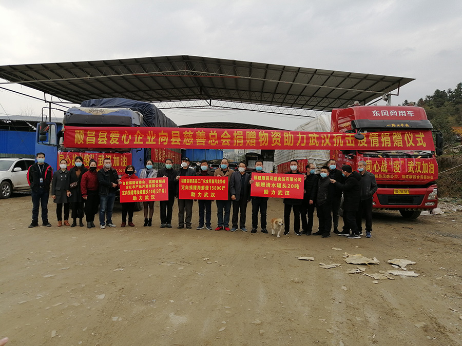 2020年3月6日,福建省順昌縣愛(ài)心企業(yè)向縣慈善總會(huì)定向捐贈(zèng)的第二批物資助力武漢捐贈(zèng)儀式在順昌縣綠通物流舉行。由臺(tái)盟福建省委會(huì)、福建省順昌合億農(nóng)產(chǎn)品開(kāi)發(fā)有限公司捐贈(zèng)的綠仙椒罐頭10噸(3千件)、福建順昌茂盛食品有限公司捐贈(zèng)的清水罐頭20噸、福建省順昌縣工廠化食用菌同業(yè)協(xié)會(huì)捐贈(zèng)的海鮮菇18800斤等物資帶著順昌人民與武漢人民共克時(shí)艱、共抗疫情的深情厚意無(wú)償馳援武漢。
