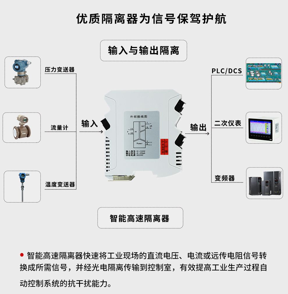 虹潤公司是專業(yè)生產(chǎn)隔離器的國家專精特新“小巨人”企業(yè)。生產(chǎn)的智能高速隔離器 ,具有電壓電流遠(yuǎn)傳電阻輸入,10ms快速響應(yīng),輸入輸出電源三隔離,高抗干擾,低功耗發(fā)熱低等特點(diǎn)。產(chǎn)品獲得信號隔離器、一種二端子模塊、無源信號隔離器等3項國家發(fā)明專利,主持起草現(xiàn)場設(shè)備工具(FDT)接口規(guī)范、工業(yè)過程測量和控制系統(tǒng)用隔離式安全柵、工業(yè)過程測量和控制系統(tǒng)用配電器等3項國家標(biāo)準(zhǔn),以及通信系統(tǒng)多通道數(shù)據(jù)采集控制終端規(guī)范軍用標(biāo)準(zhǔn)。取得智能高速隔離器等3項相關(guān)軟件著作權(quán)。參與國際5G標(biāo)準(zhǔn)制定。產(chǎn)品廣泛應(yīng)用于電力、石化,冶金、制藥、水處理、機(jī)械配套等各種工業(yè)現(xiàn)場。