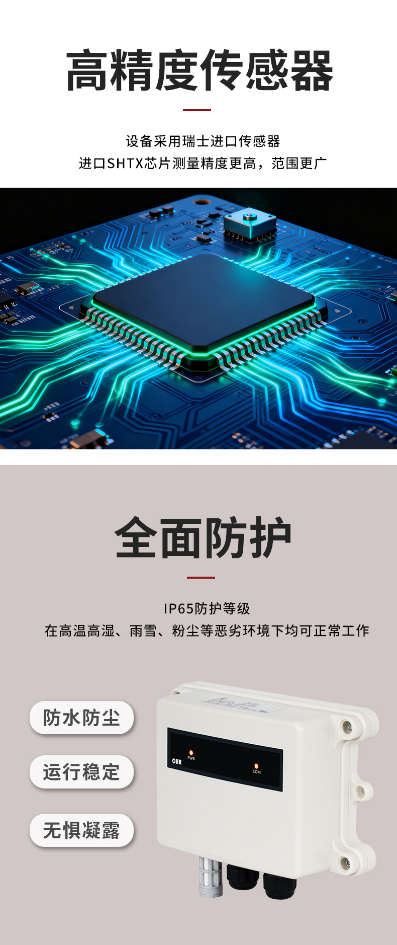 虹潤公司是專業(yè)生產(chǎn)環(huán)境監(jiān)測儀表的國家專精特新“小巨人”企業(yè)。生產(chǎn)的一體式溫濕度變送器,具有溫度、濕度、露點高精準(zhǔn)的測量與變送,報警繼電器輸出,RS485/RS232通訊,IP65防護(hù)等級等特點。產(chǎn)品獲得一種手持式低功耗溫濕度檢測儀、大屏幕溫濕度記錄儀等2項國家發(fā)明專利,主持起草物聯(lián)網(wǎng)智能溫度儀表通用技術(shù)條件、冷鏈溫度記錄儀等2項國家標(biāo)準(zhǔn),以及通信系統(tǒng)多通道數(shù)據(jù)采集控制終端規(guī)范軍用標(biāo)準(zhǔn),以及現(xiàn)場設(shè)備集成等5項智能制造國家標(biāo)準(zhǔn),參與國際5G標(biāo)準(zhǔn)制定,取得溫濕度儀表等3項相關(guān)軟件著作權(quán)。產(chǎn)品廣泛應(yīng)用于工業(yè)現(xiàn)場、農(nóng)業(yè)大棚、倉儲物流、地下管廊、養(yǎng)殖孵化、配電機(jī)房等諸多領(lǐng)域。