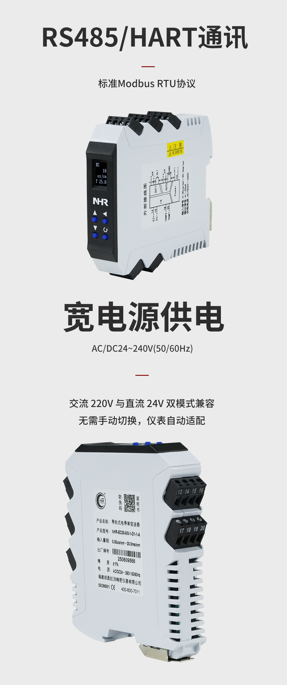 虹潤公司是專業(yè)生產(chǎn)水質(zhì)分析儀的國家專精特新“小巨人”企業(yè)。生產(chǎn)的導(dǎo)軌式電導(dǎo)率變送器,具有測量穩(wěn)定不跳字,液晶按鍵操控,變送輸出精準(zhǔn),寬范圍電源供電,RS485或HART通訊等特點(diǎn)。產(chǎn)品獲得一種信號(hào)發(fā)生裝置、智能化控制器等2項(xiàng)國家發(fā)明專利;主持起草現(xiàn)場設(shè)備集成等5項(xiàng)智能制造國家標(biāo)準(zhǔn),以及現(xiàn)場設(shè)備工具(FDT)接口規(guī)范、工業(yè)過程控制系統(tǒng)用模擬輸入兩位或多位輸出儀表、過程分析技術(shù)系統(tǒng)等3項(xiàng)國家標(biāo)準(zhǔn);參與國際5G標(biāo)準(zhǔn)制定,取得導(dǎo)軌電導(dǎo)率變送器等3項(xiàng)相關(guān)軟件著作權(quán)。產(chǎn)品廣泛應(yīng)用于實(shí)驗(yàn)室、水處理、環(huán)境監(jiān)測、制藥、食品、農(nóng)業(yè)、工業(yè)流程控制等諸多領(lǐng)域。