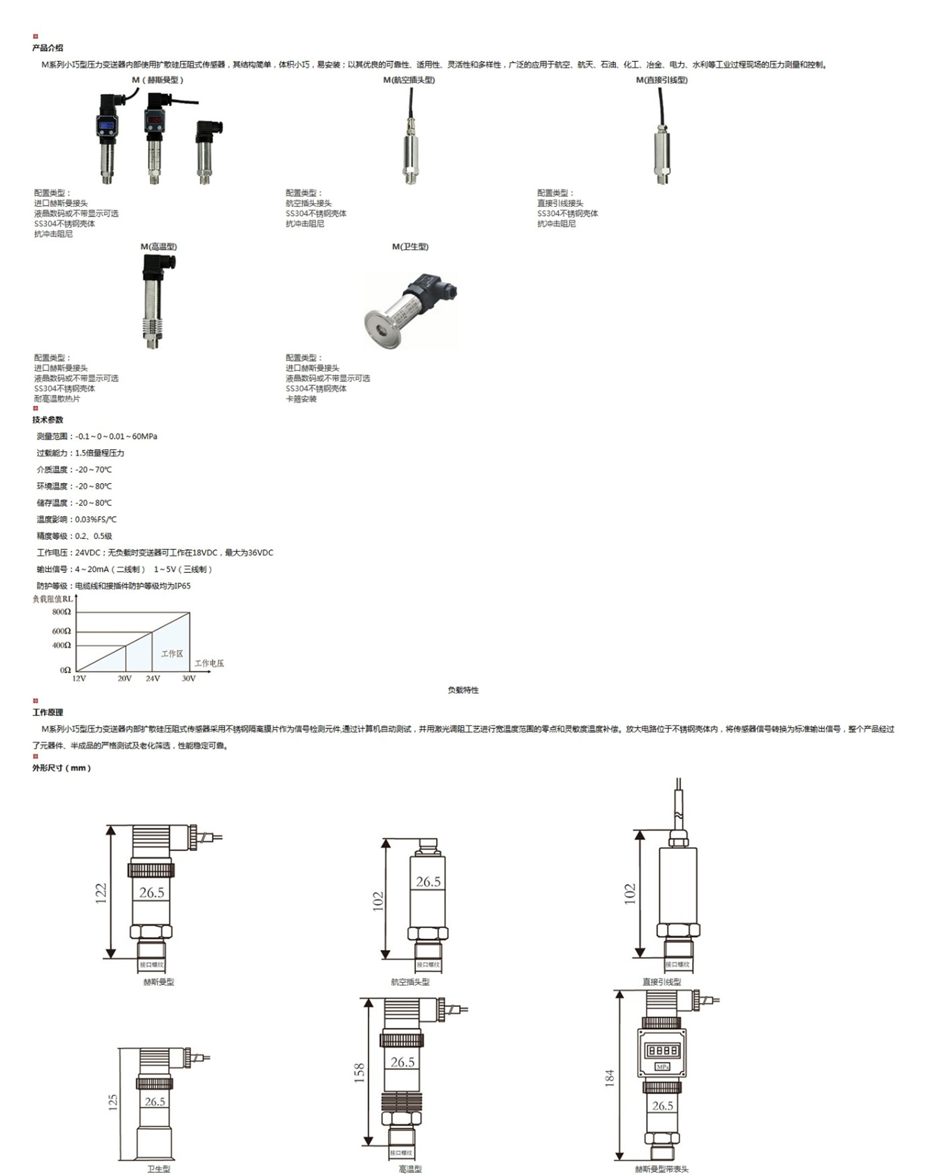 M系列小巧型壓力變送器內(nèi)部使用擴(kuò)散硅壓阻式傳感器,其結(jié)構(gòu)簡(jiǎn)單,體積小巧,易安裝;以其優(yōu)良的可靠性、適用性、靈活性和多樣性,廣泛的應(yīng)用于航空、航天、石油、化工、冶金、電力、水利等工業(yè)過(guò)程現(xiàn)場(chǎng)的壓力測(cè)量和控制。