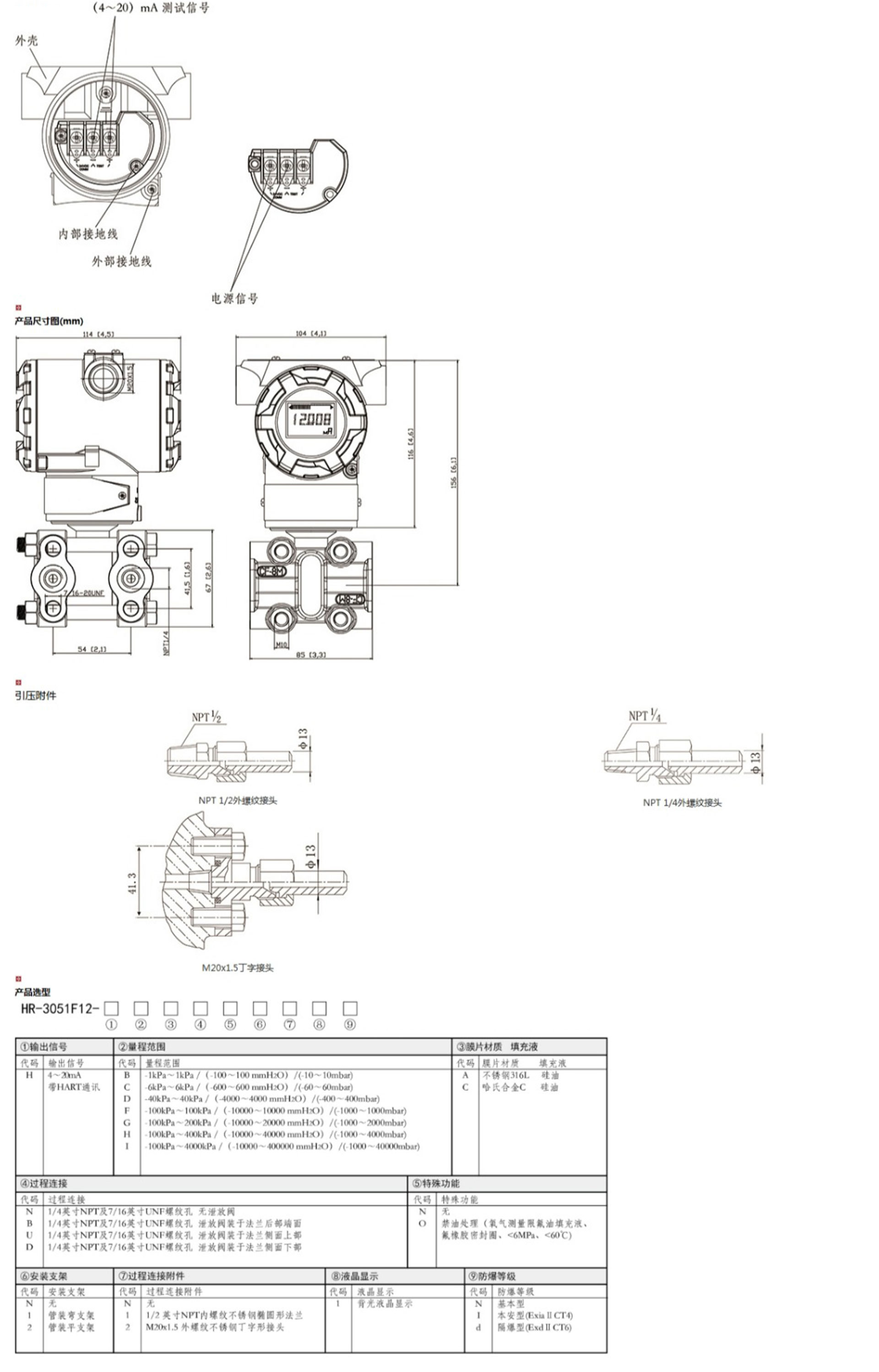 HR-3051F12智能單晶硅夾板式壓力變送器能準確的測量壓力,并把它轉(zhuǎn)換成4~20mADC的輸出信號。該變送器可通過三按鍵本地操作,或通用手操器、組態(tài)軟件、以及手機APP遠程操作,在不影響4~20mA DC的輸出信號的同時,進行顯示與組態(tài)。